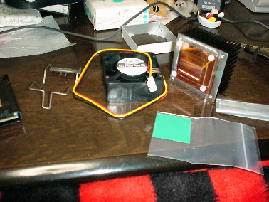 ALPHAのFC−PGA用ヒートシンク! 大型で、マザーボードギリギリでした(笑)。 写真は組み立て前のもの。 |